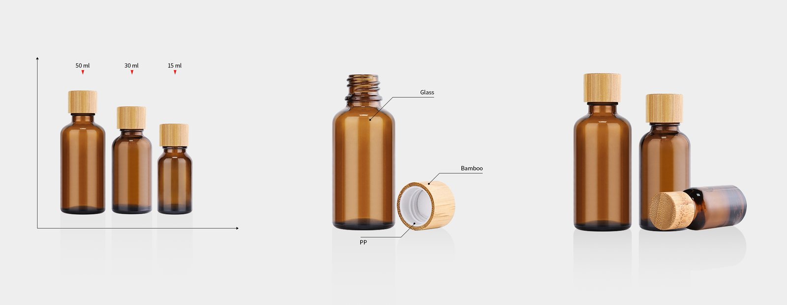 15ml 30ml 50ml Round Amber Glass Bottle, Good Choice with treatment essential Oil , Small sizes are nice and easy to take-away. we Specially match them with Bamboo Cap, No Leakage and more Natural-feeling. except the Bamboo screw caps, Button Dropper is a good choice too, easy to spout out with certain outputs.