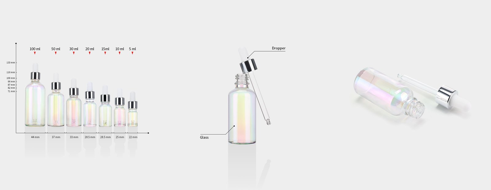 Glass bottles are UV coating with Rainbow color which makes your bottles looks outstanding from others. at the same time ,matching with a Silver Collar Dropper , they are perfect for premium Skincare Serum Package or Hair Repair Products.